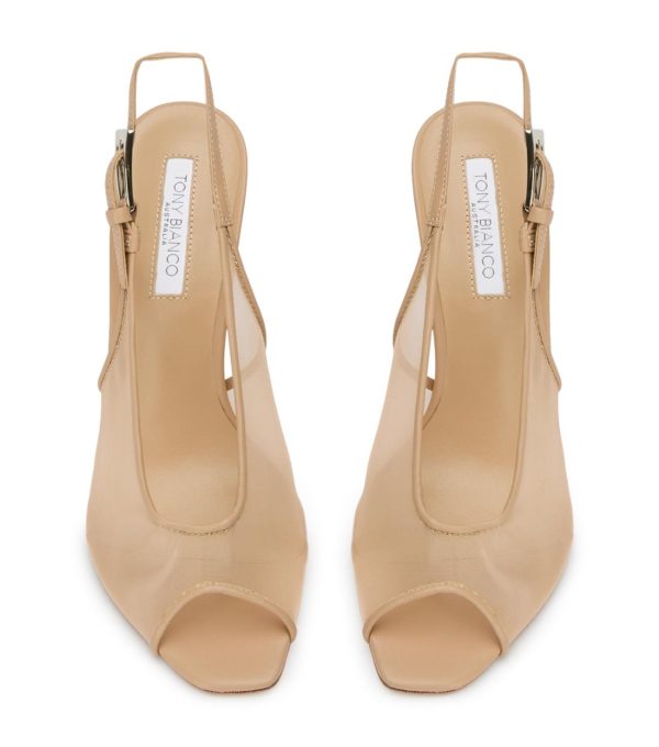 Dare is a stiletto slingback with a peep toe and sheer mesh construction that’s anything but shy. A delicate buckle finishes the look, adding structure to its barely-there feel.