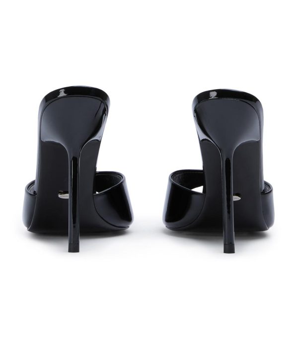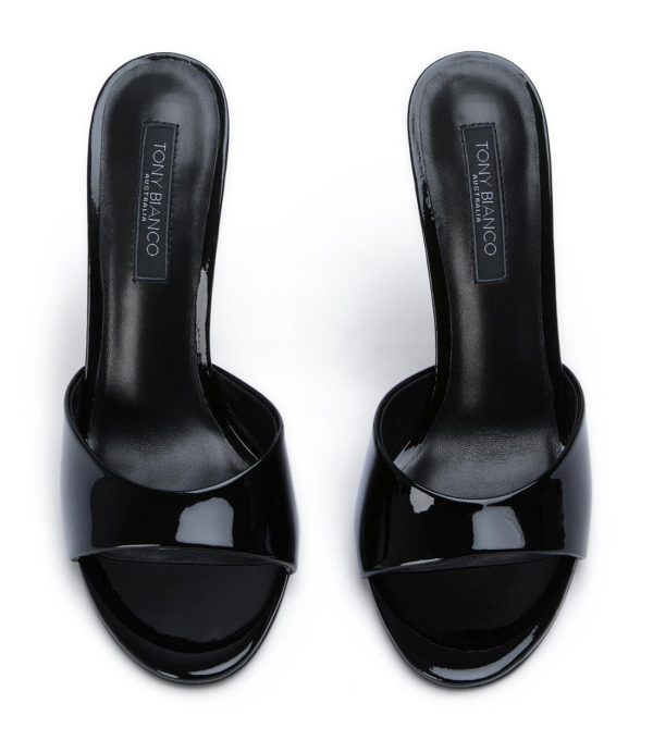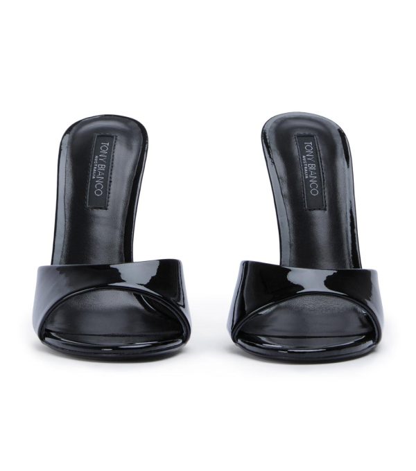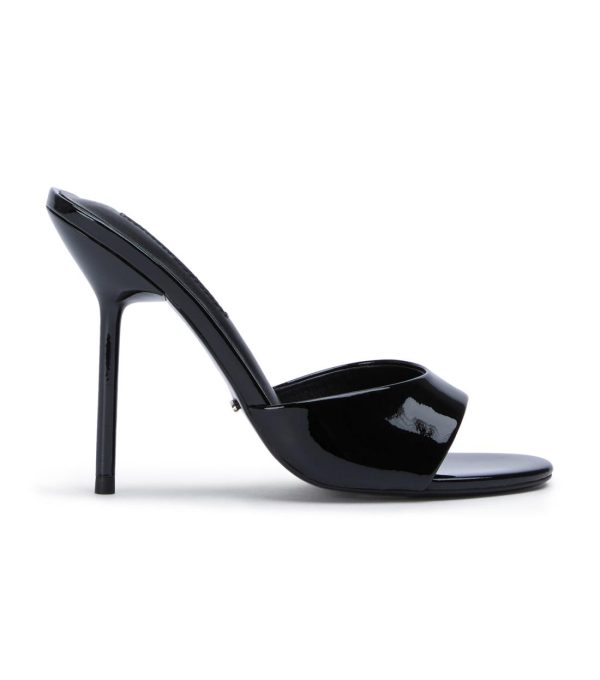 Simplistic, sophisticated and most definitely a wardrobe staple, meet Kate. Featuring a stiletto heel, curved upper vamp and open round toe, this black patent mule will be worn on repeat on season long.