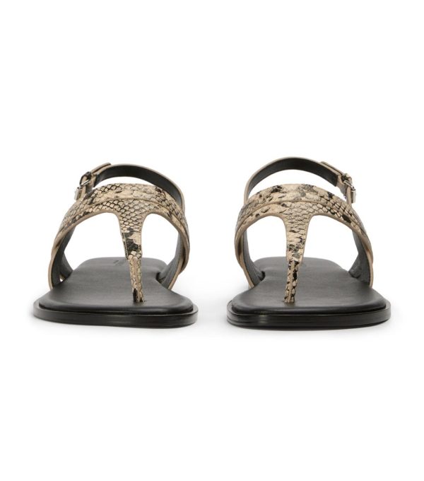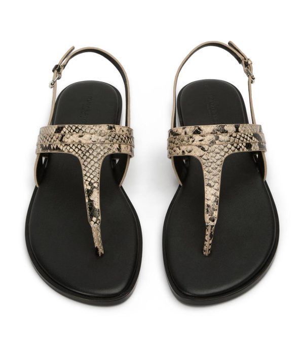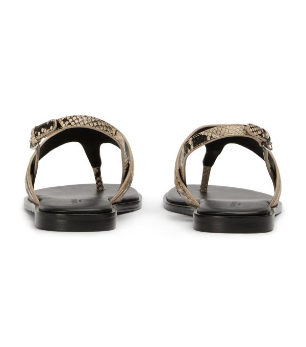 A modern take on the classic flip-flop style, here is Talia. With an adjustable ankle strap and cushioned footbed, this snake print sandal is not only sleek and stylish but also comfortable and supportive, making her your new go-to.